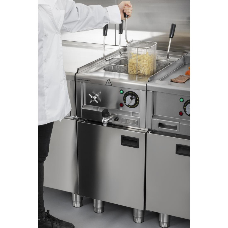 De elektrische pastakoker uit de Buffalo 600-serie is een uitstekende oplossing voor professionele keukens waar pasta op het menu staat. Of u nu pasta, noedels, knoedels of groenten kookt, met de Buffalo pastakoker is er geen aparte gas- of elektrische kookplaat meer nodig, waardoor het proces wordt overgebracht naar een betrouwbaar aanrechtstation met hoge capaciteit. De Buffalo pastakoker is ongelooflijk eenvoudig te gebruiken en beschikt over een grote corrosiebestendige tank van 15 liter, ontworpen om op een leidingwateraansluiting te worden aangesloten. Zo kun je de tank snel bijvullen met de bedieningskraan aan de voorkant ¿ je hoeft de machine niet te verplaatsen of kannen bij te vullen. De pastakoker beschikt ook over een aan de voorzijde gemonteerde aftapkraan, waardoor u het gebruikte water eenvoudig kunt afvoeren, zodat u klaar bent voor schoonmaak of stilstand. De Buffalo pastakoker geeft u de precisie om de kookresultaten te verkrijgen waarnaar u op zoek bent. Met instelbare temperatuurregeling en aparte draadmanden is de pastakoker perfect voor het koken van pasta op bestelling. Deze pastakoker maakt deel uit van de Buffalo 600-serie en is ontworpen om te combineren met andere apparaten uit de 600-serie, waardoor u een nette, naadloze kooklijn krijgt, ongeacht de grootte van uw keuken.