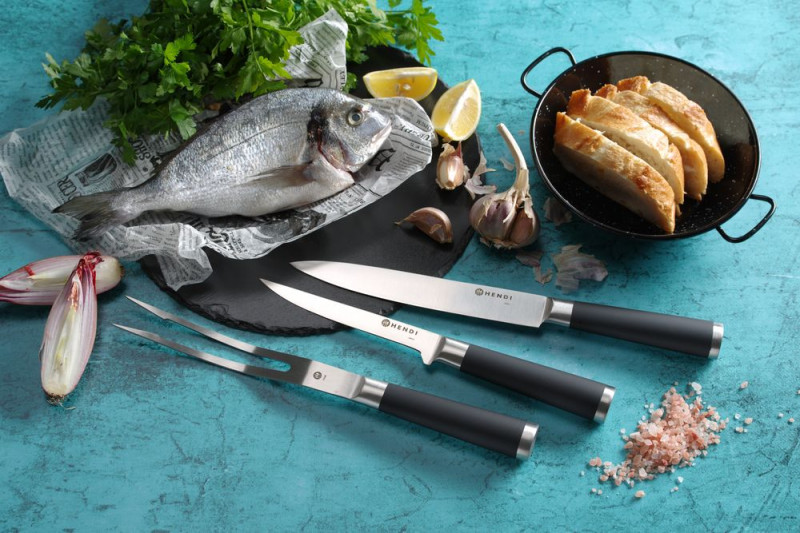 Gemaakt van één stuk hard, roestvast staal 3Cr13. Handgreep van roestvast staal 430 met anti-slip rubberen coating. Door de hoogste kwaliteit van het vakmanschap zijn messen duurzaam en bestand tegen corrosie met een langdurige scherpte van het mes. Met veilige, geprofileerde handgreep. De set omvat: