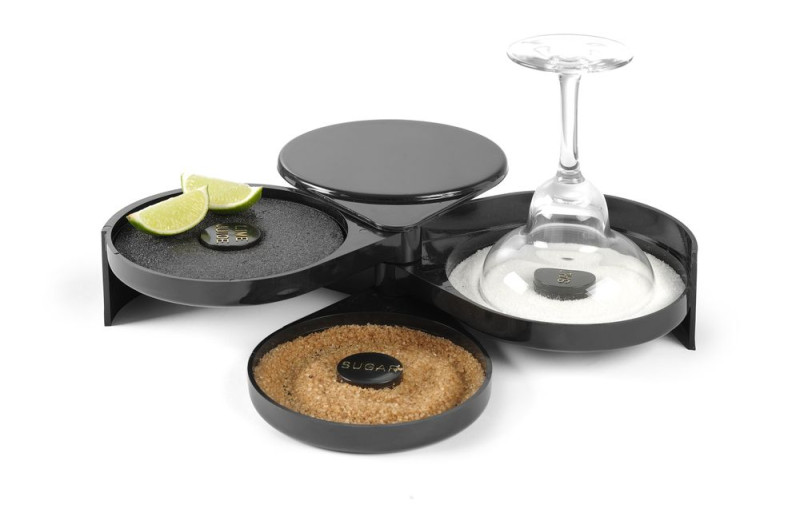 Voor het verfraaien van de randen van glazen. Drie lagen voor limoensap, zout en suiker. Met spons voor het limoensap om morsen te voorkomen.