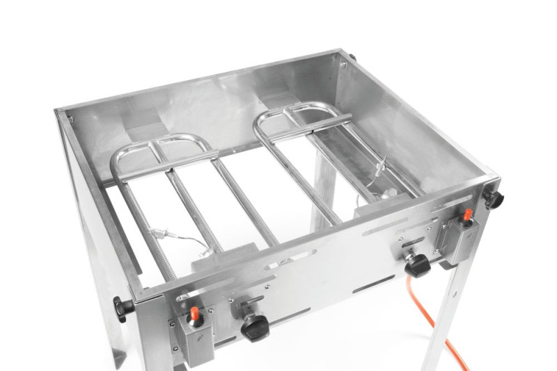 Frame gemaakt van 18/0 roestvast staal. Met verchroomd rooster en geëmailleerde braadpan. Binnenmaat braadpan 590x480 mm. Elektronische ontsteking en thermokoppel. Inclusief gasslang en drukregelaar. Geschikt voor propaan- of butaangas. Verbruik 0,430 m³/u.