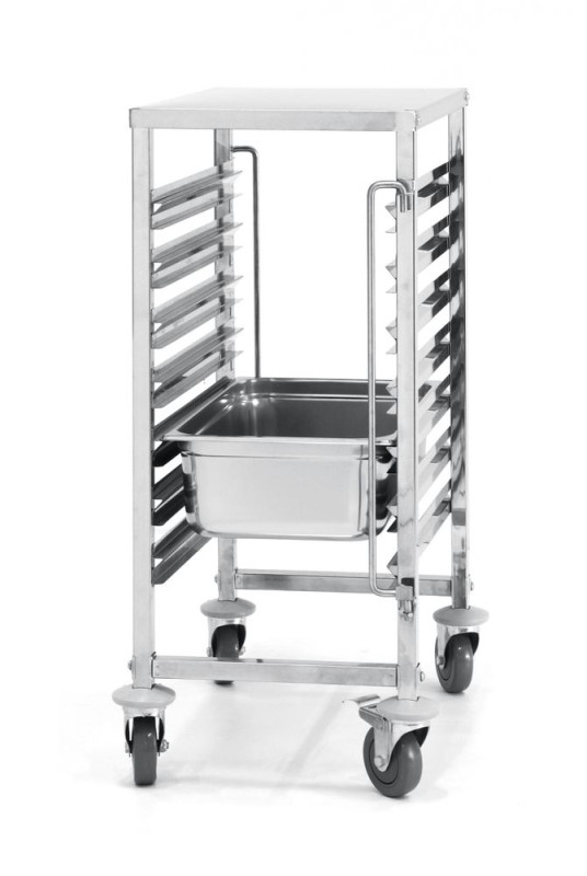 Ontworpen voor GN 1/1 dienbladen/bakken - tussenruimte 80 mm. Met werkoppervlak. Aan beide zijden een vergrendeling voor de plateau’s Voorzien van 4 zwenkwielen waarvan 2 geremd. GN 1/1 - 530x325. Flatpack levering.