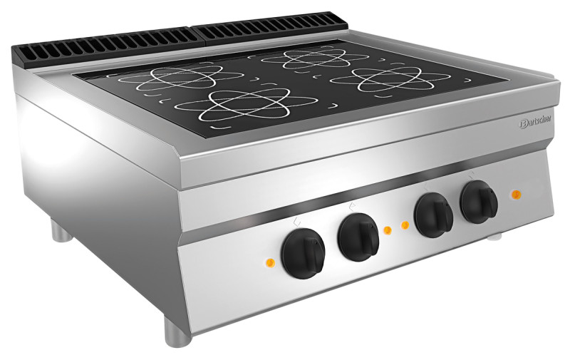 De inductiekookplaat met 4 kookplaatsen uit de serie 700FX biedt uiterste flexibiliteit - Inzetbaar als tafelapparaat of gecombineerd als staand apparaat. De kookplaatsen met een diameter van 22 cm en een vermogen van elk 5 kW beschikken over een panherkenning en kunnen worden geregeld in 6 vermogensniveaus.