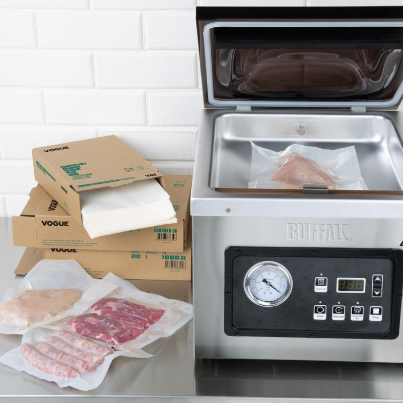 Bewaar en conserveer voedsel langer met de 200x300mm Vogue composteerbare vacuümzakken. Zeer duurzaam en eenvoudig in gebruik, zijn de zakken een essentiële toevoeging aan elke professionele keuken, bieden efficiënte, hygiënische opslag en helpen de bewaartijd tot 3-5 dagen te verlengen. Geschikt voor opslag in vriezers, koelkasten en koelruimtes, zijn deze betrouwbare zakken ook geweldig om het volume van voedsel te verminderen, waardoor meer items kunnen worden opgeslagen in vergelijking met omvangrijke dozen of niet-gesloten zakken. De Vogue-zakken zijn geschikt voor koken, magnetron en sous vide, waardoor ze een uitstekende keuze zijn voor het snel opwarmen van gerechten of het bereiken van fantastische texturen en smaken. Wanneer ze worden gebruikt in combinatie met een geschikte vacuümverpakkingsmachine (apart verkocht), worden de zakken luchtdicht afgesloten, wat helpt om de smaak van uw gekruide ingrediënten te behouden en zelfs te versterken. En eenmaal gebruikt, zijn deze zakken ook composteerbaar, wat een verminderde milieu-impact betekent.